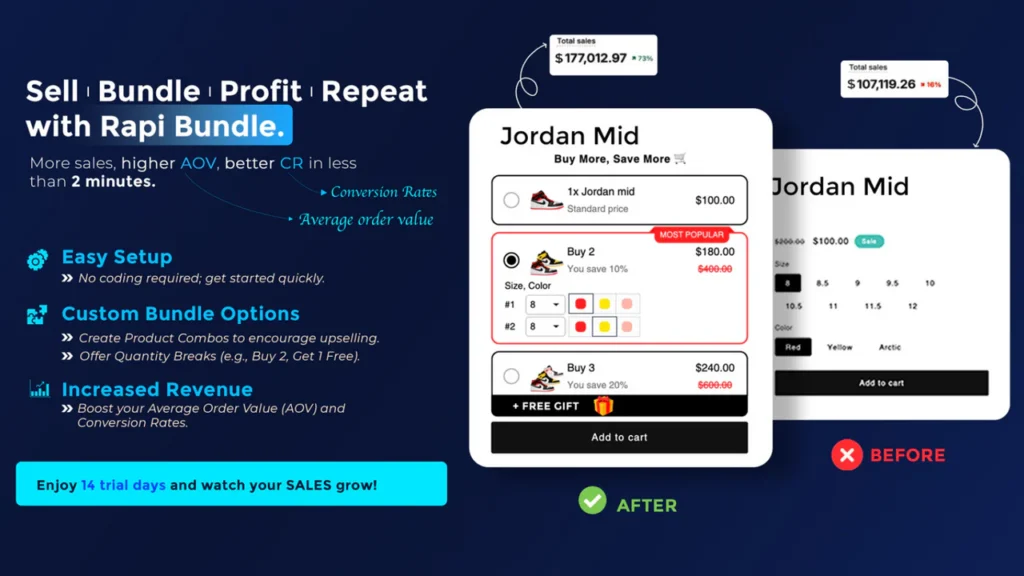 Boost your AOV: Boost your sales using bundles, quantity discount, BOGO (Buy One Get One FREE), upsells, Pumper, rebuy order, Volume, tiered pricing, Volume discount, wide bundles, tiered discount, Bundle & Bulk, frequently bought together & Quantity Breaks. Select your product, add quantity breaks (OCU) or a wide bundle, kaching bundle builder, Display discounted prices, mix and match, customize the style & publish. By increasing the average order value (AOV), you can boost revenue.